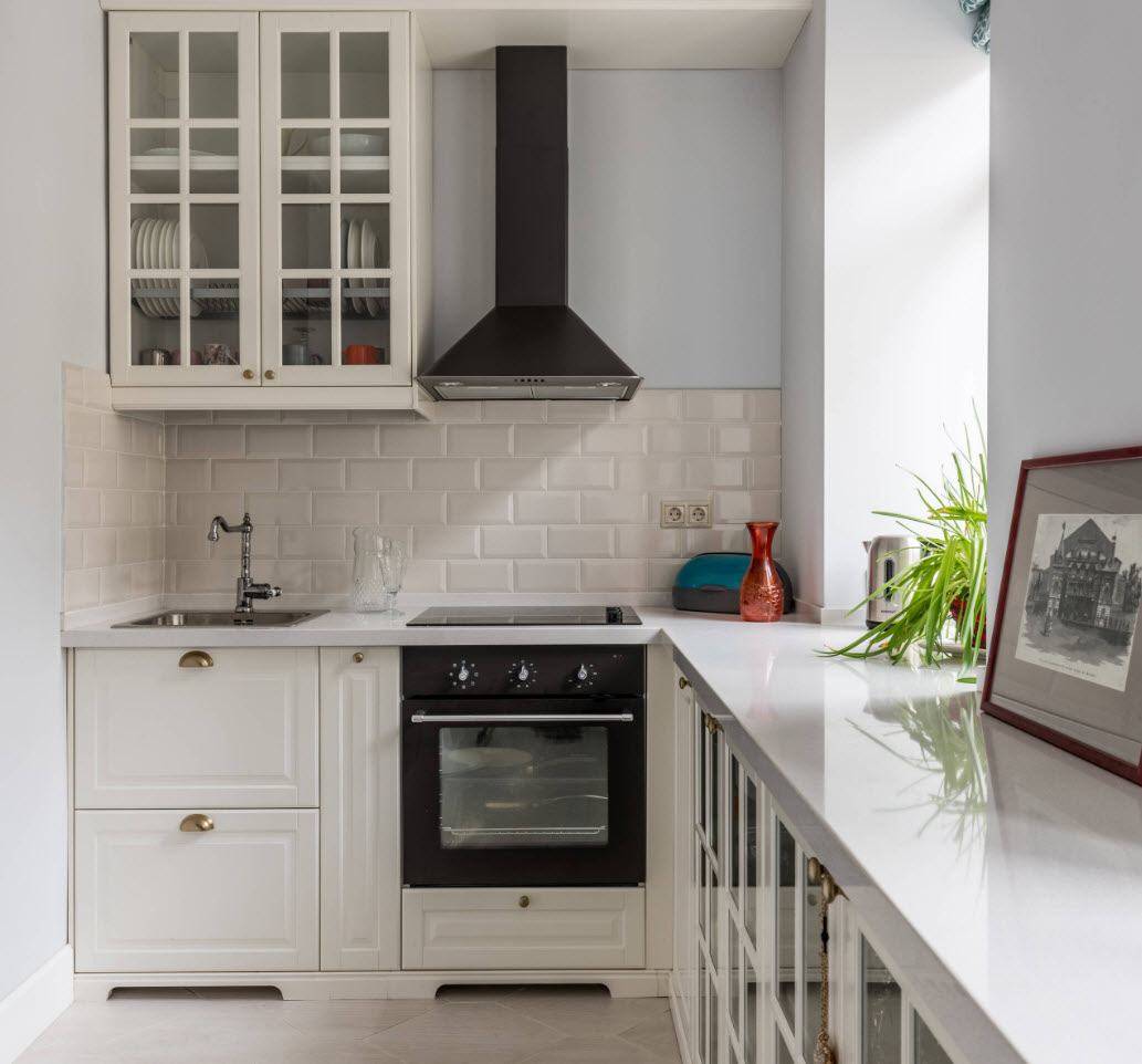 Данный стиль соединил в себе классику и минимализм и подразумевает применение ахроматических цветов (белого, черного, серого), иногда – цвета дерева. Наряду с очень простым и функциональным белым кухонным гарнитуром на кухне с таким дизайном присутствует современная техника. Закрытые непрозрачные фасады помогают поддерживать постоянную чистоту.