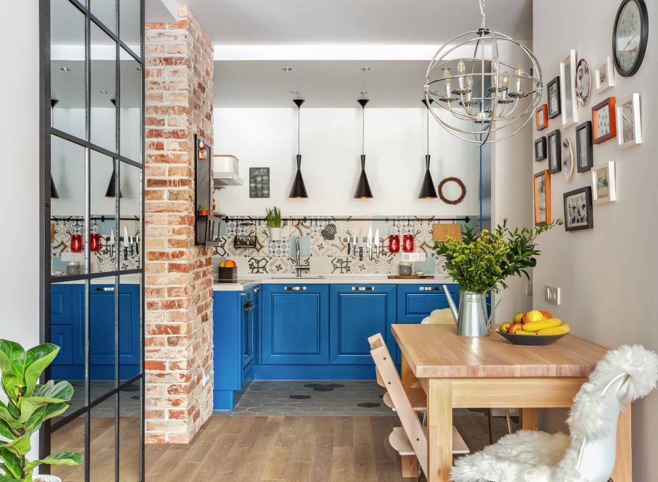 Если светлые оттенки создают спокойную атмосферу в помещении, то яркая цветовая гамма делает обстановку динамичной, живой, эффектной. Насыщенные цвета улучшают настроение, заряжают энергией, помогают бороться с депрессией, некоторые из них могут улучшать аппетит. В интерьере кухни интересно смотрится сочетание оранжевого с синим оттенком, одну из стен можно оформить белым кирпичом.