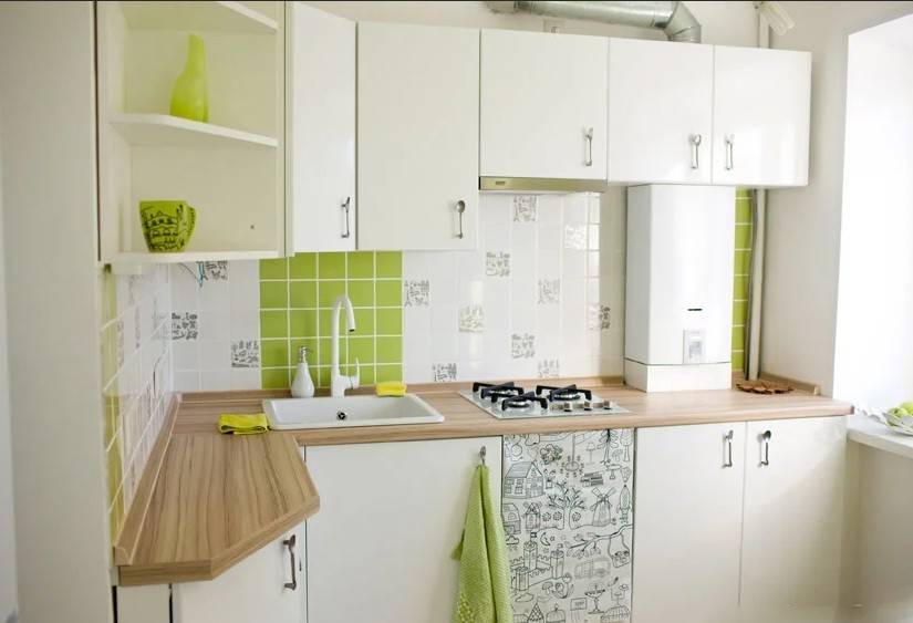 Как выполнить дизайн кухни 6 квадратных метров в хрущевке с колонкой, фото демонстрируют наглядно. Традиционно газовая колонка в таком жилье искусно встроена. Это легко осуществимо вкупе с навесным шкафчиком над столешницей или рабочей поверхностью. Колонку запрещено размещать близко: