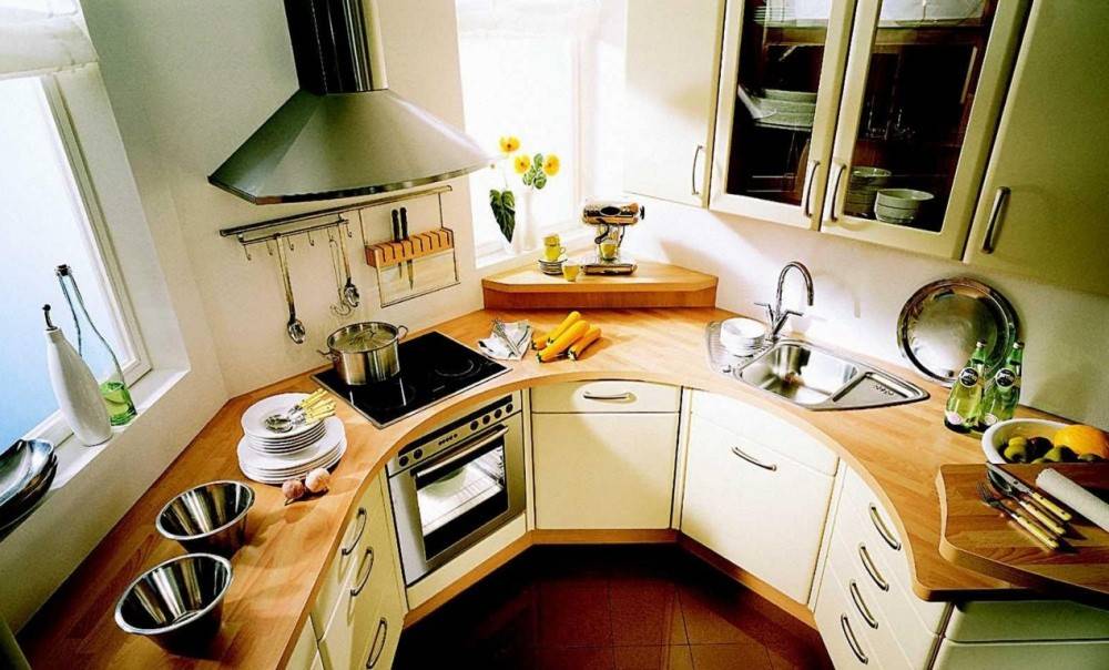 Самой удобной кухней для «хрущевки» считается угловая, то есть при которой предметы мебели размещаются Г-образно. В этом случае весьма просторная угловая зона не пропадает, а сам угол либо остается прямым, либо становится плавным. Крайние составляющие гарнитура рекомендуется сделать закругленными, чтобы расширить проход. Линейная «стенка» подходит в тех случаях, когда отсутствует потребность в большом количестве модулей. Гарнитур в виде буквы «П» более уместен, если кухня совмещена с гостиной, а значит, обеденная зона в ней отсутствует. Тогда свободное пространство можно заполнить шкафчиками.