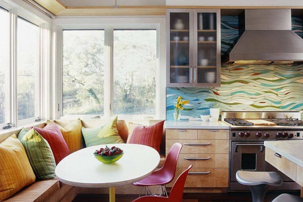 Столовая зона на кухне, размером девять метров квадратных, оформляется достаточно компактно – небольшой столик с парой-тройкой стульев, удобным диванчиком, обычно размещается около свободной стены. Реже встречается островной вариант, но гарнитур тогда должен быть небольшим.