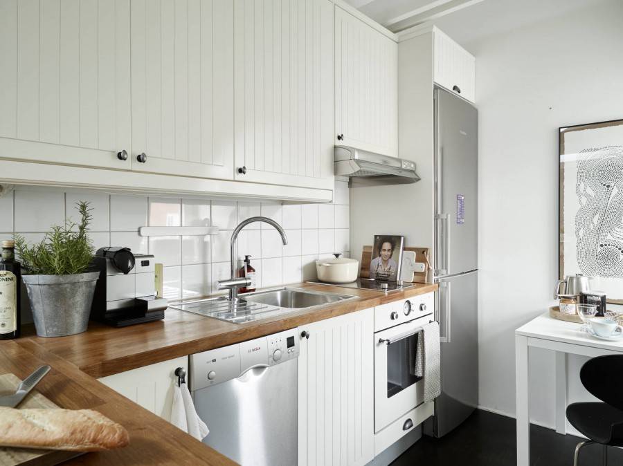 Лофт — еще один модный и относительно новый стиль, подходящий для молодых людей (почему-то более старшее поколение его не воспринимает). Вовсе необязательно выбирать для оформления мрачные оттенки кирпича, белый — это то, что нужно маленькой кухне. Текстиль из натуральных материалов, грубоватый деревянный стол, напольная керамическая плитка с фактурой «под бетон», пара-тройка подходящих аксессуаров в виде часов или постеров — и современный ненавязчивый лофт готов!