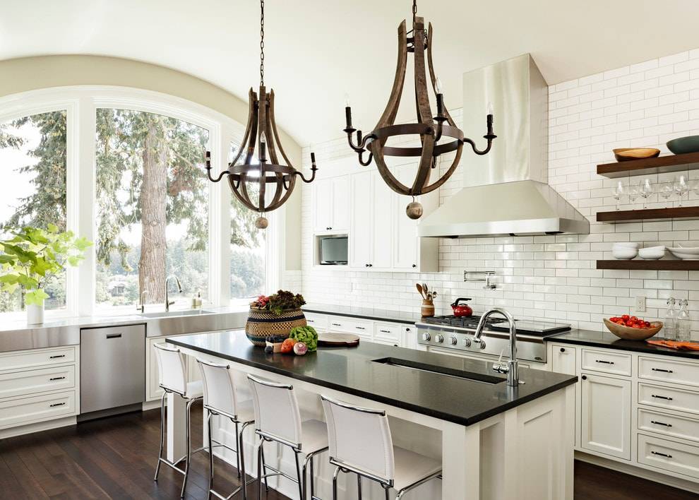 В современных кухнях нередки случаи совмещения кухни с гостиной. В этом случае зоны легко разделить, используя два источника освещения. Они могут быть разными по своей яркости, интенсивности или оттенку.