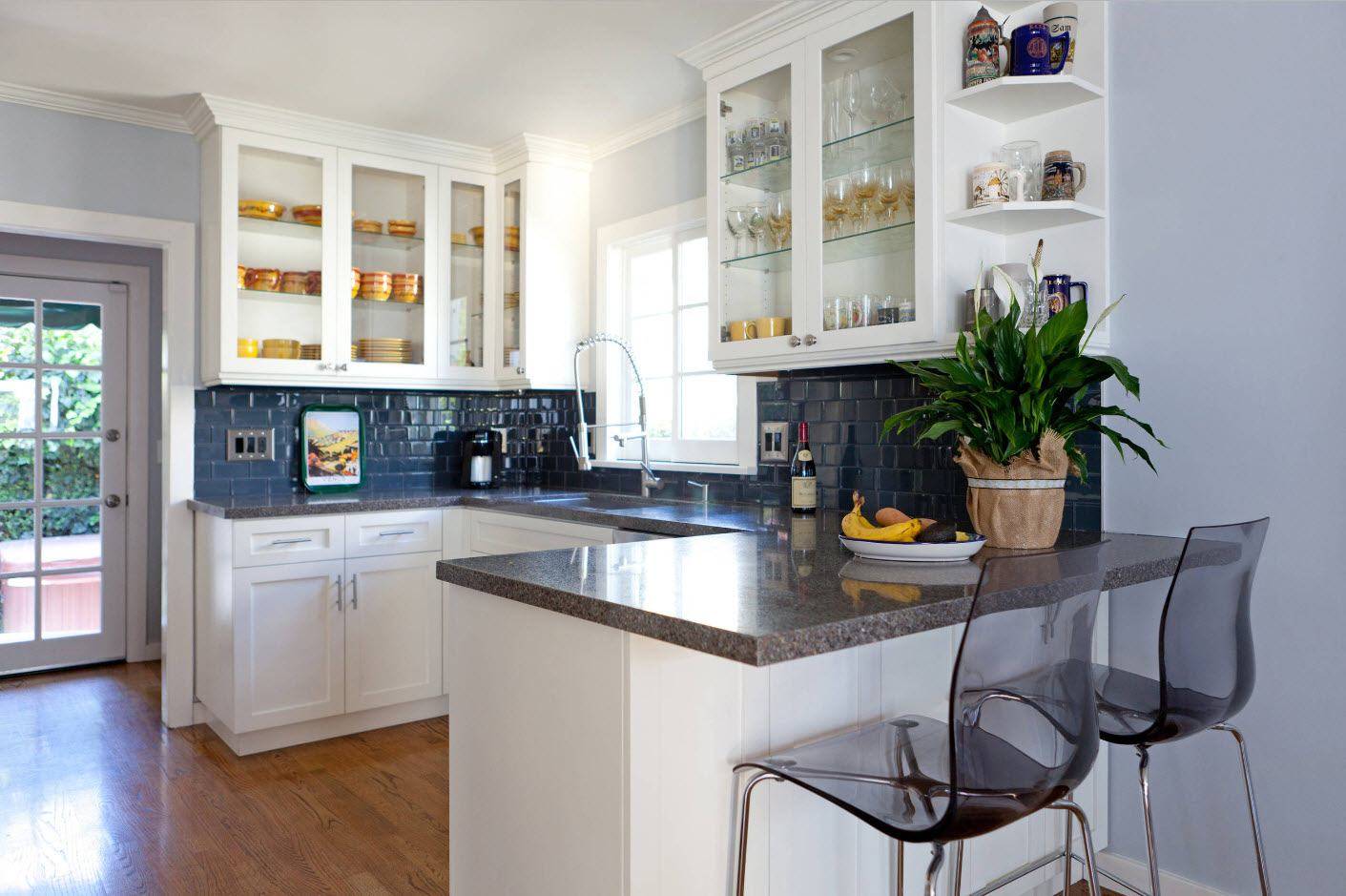 - П-проект. Хорошее решение для молодой семьи или холостяка. Обеденная зона остается невыделенной, вместо нее – стильная барная стойка или полуостров. Широкая стойка может применяться в качестве стола, если достаточно места для необходимого количества стульев. Такой вариант также подойдет для вытянутых кухонь.