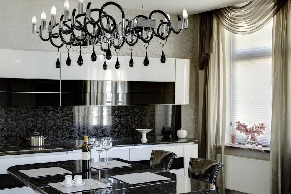 Чтобы сделать акцент на классике, стоит украсить кухню при помощи хрустальных светильников, декоративной лепнины и чистейшего фарфора.