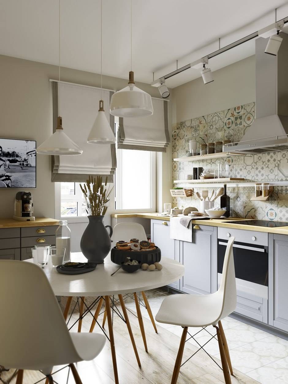 Скандинавский стиль — одно из универсальных направлений, в основе которого лежит белый и разные деревянные поверхности. Светлый цвет как нельзя лучше подойдет скромным габаритам любой кухни. Причем белыми могут быть не только стены, но и сам гарнитур. Дополнить и разбавить стерильную белизну помогут цветовые акценты на шторах, посуде и элементах декора. Столешница с фактурой дерева, а также пол с похожей текстурой дополнят скандинавский интерьер угловой маленькой кухни.