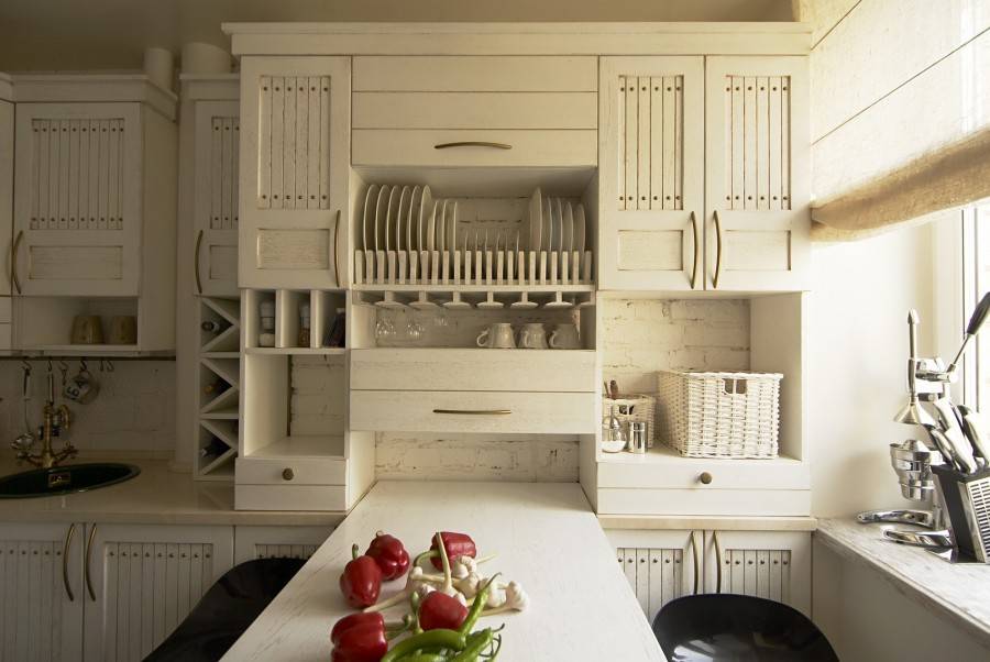 Традиционный вариант кухни формируется массивными шкафами для различных предметов, пачек соли, специй и других полезных расходных материалов. Его особенностью считается долговечность и непритязательные формы мебели.