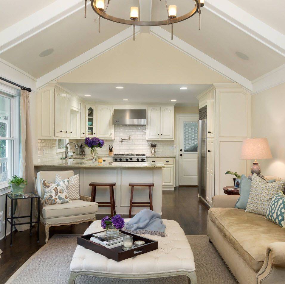 Кухня, соединенная с гостиной и оформленная в светлых тонахИсточник stroy-podskazka.ru
