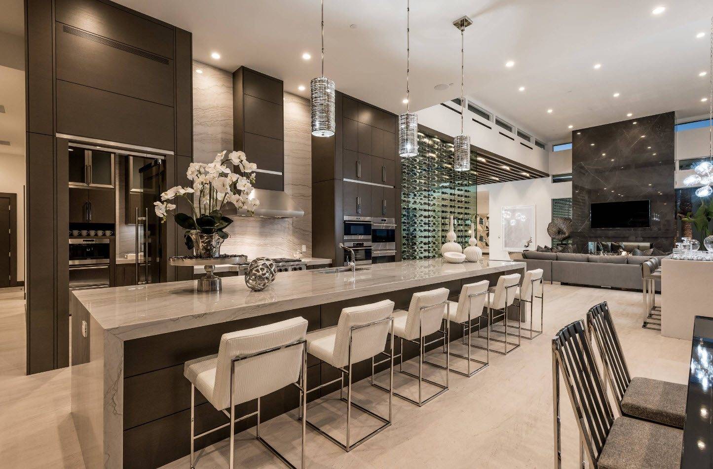 Барная стойка. Она не только стильно разграничивает пространство, но и служит дополнительной рабочей поверхностью, а также для завтраков и ужинов