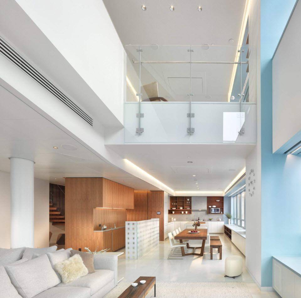 Особое внимание стоит уделить потолку. Подвесная конструкция позволит соединить все функциональные зоны в одно целое