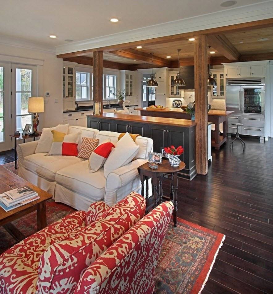 Сходное с указанным выше стилем, это направление больше тяготеет к деревенскому восприятию обстановки. Подходит все, что имеет ассоциацию с данной тематикой. Причем совсем не обязательно подбирать всю обстановку исключительно из натуральных материалов. Напротив, имеет смысл больше применять всевозможные имитации. К примеру, наиболее ярким элементом вашей гостиной могут стать полиуретановые конструкции балок «под дерево». Хорошим вспомогательным нюансом станут высокие потолки. В этом случае вы можете смело реализовывать наиболее продвинутые идеи данного стиля.