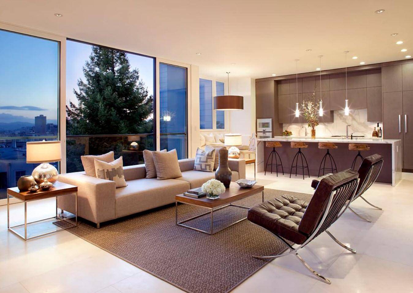 Как известно, это стилевое направление охотно реализуют в своем интерьере люди, чей ритм жизни отличается динамичностью. Внутреннее убранство квартиры не является самоцелью, здесь доминируют элементы обстановки, отличающиеся, в первую очередь, практичностью и удобством. В дизайне преобладают современные материалы и технологии, в общей концепции – простор, который можно легко реализовать даже для относительно небольших пространств. Такие дизайнерские хитрости, как глянцевая поверхность мебели, а также шторы, пол и потолок со светлыми оттенками дают зрительное расширение пространства. В итоге получаем просторное, светлое и функциональное пространство.
