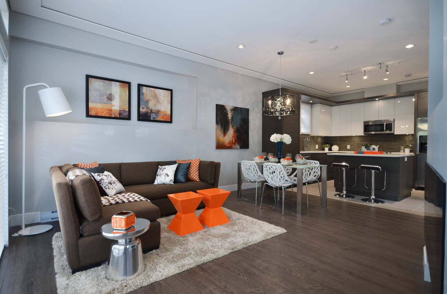 Помещение должно выглядеть как единое целое. Для этого подбирают оформление в одном стиле или сочетают несколько вариантов. В студии можно использовать мебель из одной коллекции, а кухонный гарнитур сочетать с отделкой журнального столика или кресел.