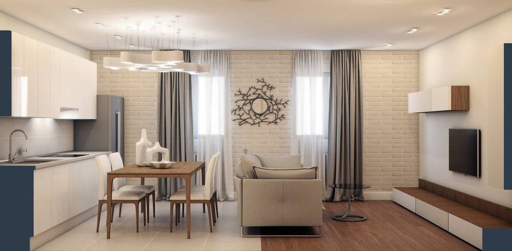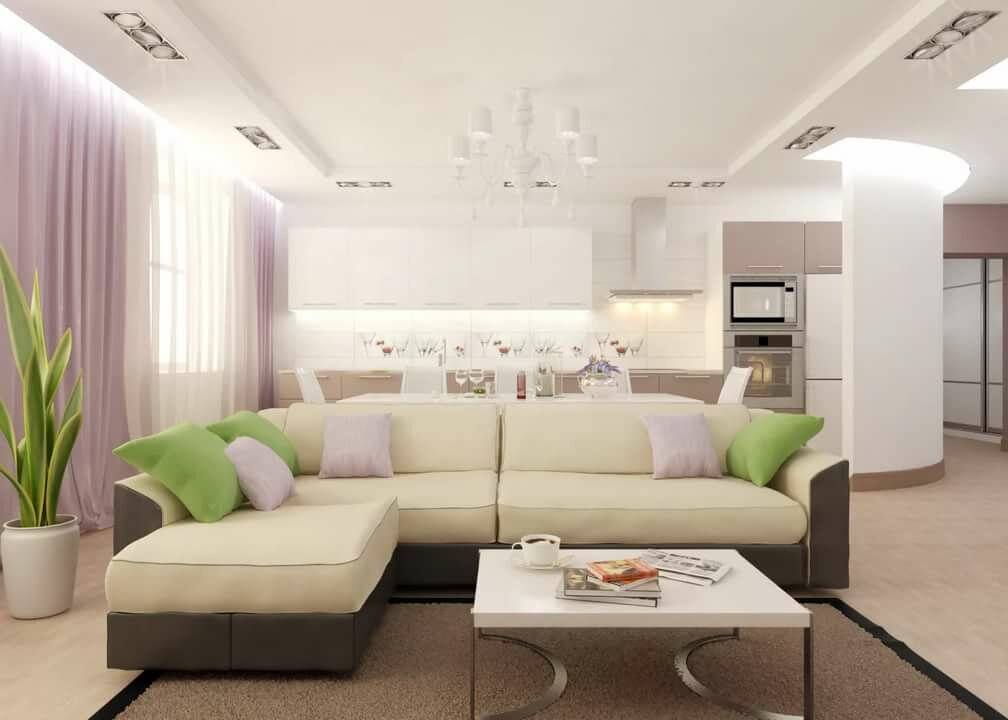 Обставляя небольшую гостиную с кухней 20 кв. м, постарайтесь максимально визуально увеличить пространство. Используйте светлые цвета, которые не только помогут вам почувствовать, что интерьер более просторен и чист.