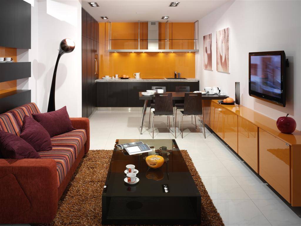 Для этого в разных углах располагают маленькие кофейные столики с креслами или выносят барную стойку. Отпадает также необходимость иметь кладовую или подсобку для хранения посуды, консервации, техники: их легко заменит крупный вместительный шкаф.