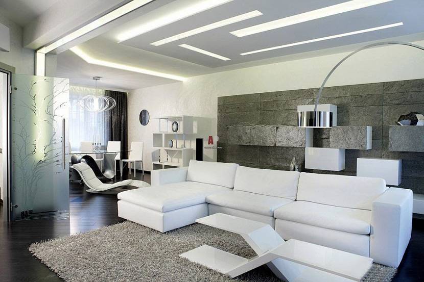- использование современных отделочных материалов. На пол принято стелить линолеум цвета металлик, ламинат или крупную керамическую плитку. Главное, чтобы на напольном покрытии отсутствовали элементы декора и орнаменты. Стены красятся, штукатурятся, оклеиваются обоями. Хорошо смотрятся пластиковые панели, с помощью которых скрываются все погрешности поверхностей. Для оформления потолка выбираются гипсокартоновые конструкции или современные натяжные полотна. Натяжные потолки с матовой или глянцевой ПВХ пленкой гармонично впишутся в современное направление, и станут его основным украшением;