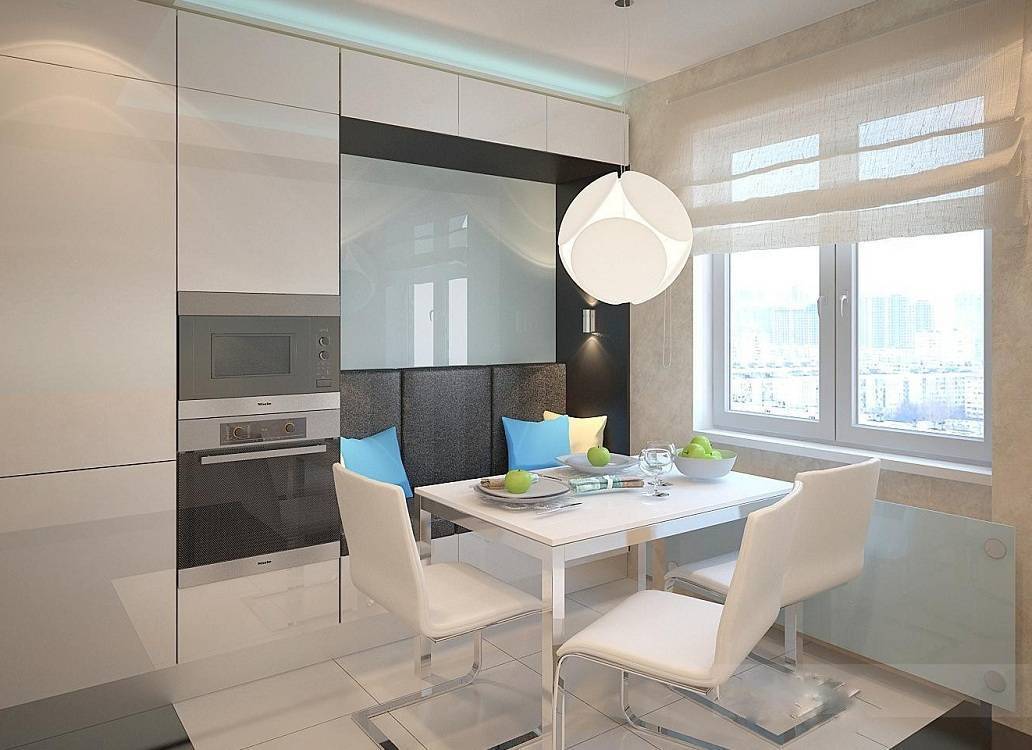 Одним из вариантов оформления помещения является игра на контрастах. К примеру, уместной будет отделка стен, пола и стола материалами белоснежного цвета в сочетании с черным или серым гарнитуром. Обязательно использование в качестве освещения точечных светильников и подсветки мебельного комплекта.