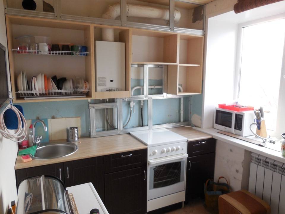 Видео показаны разные идеи обустройства кухни в хрущёвке с газовой колонкой: