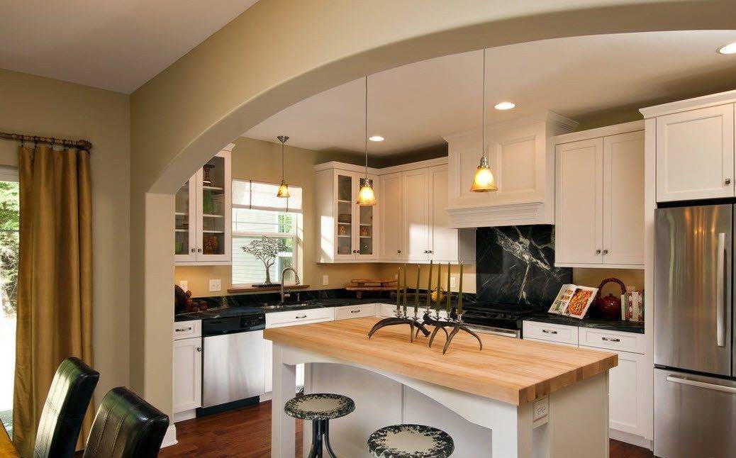 Расширенный проем между кухней и гостиной можно оформить в виде арки. Но по сравнению с 1990-ми и 2000-ми годами их вид поменялся. Сегодня актуальны вытянутые в высоту арочные проемы, без массивного оформления в форме камня или дерева.
