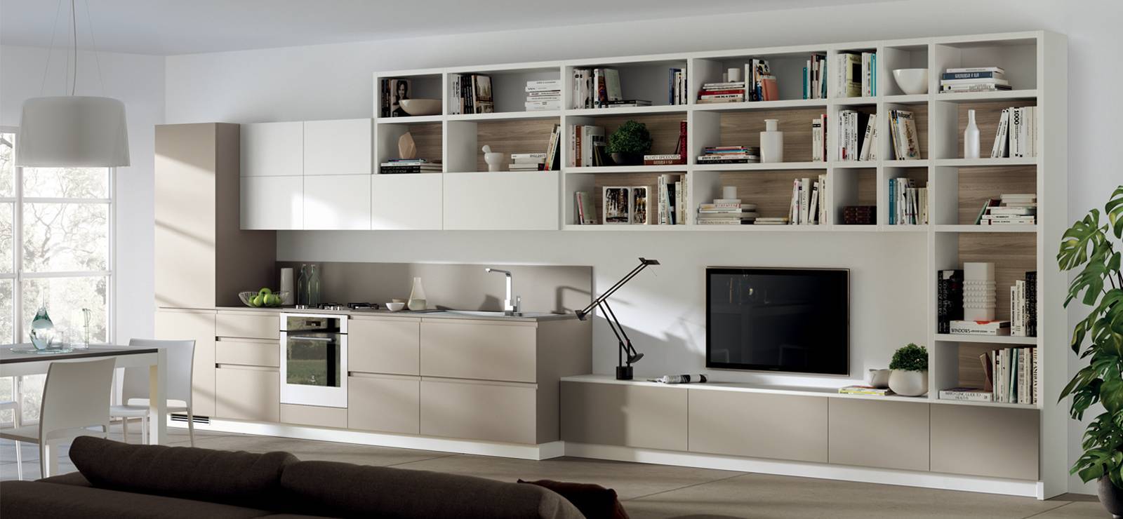 Наверняка в зоне гостиной будет присутствовать корпусная мебель – например, тумба под телевизор, стенка-горка или стеллаж, комод и т.д. Простое и эффективное решение – сделать фасады кухонных шкафов и остальной корпусной мебели одинаковыми. Это объединит пространство.
