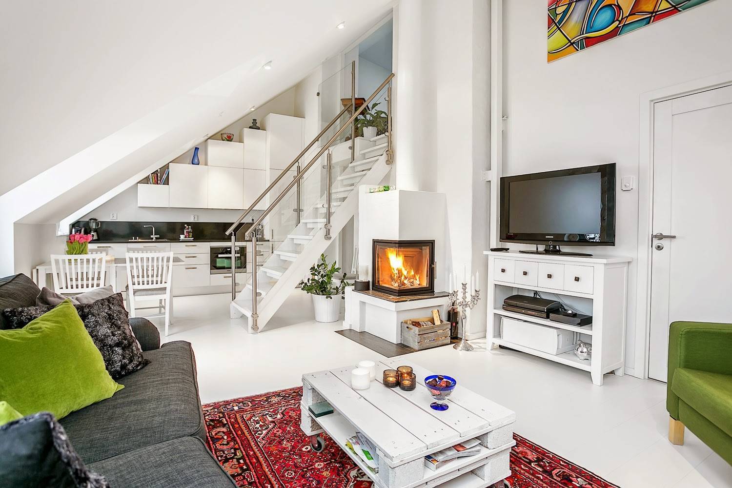 Не менее домашней считается кухня — гостиная, расположенная на мансарде. Нестандартность помещения добавляет ещё больше стиля и изыска кухне-гостиной. Небольшие размеры — не помеха. Оформить интерьер на мансарде можно не хуже, чем студию в обычном помещении.