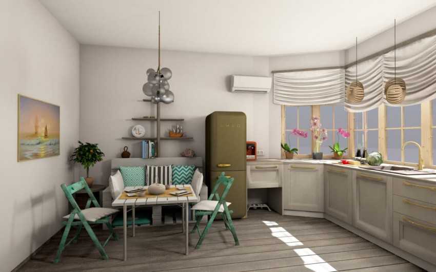 Если с кухней граничит балкон, то можно сделать перепланировку и убрать стену. Соединив две комнаты у вас получится огромная кухня, где можно будет разместить еще и мягкую мебель.