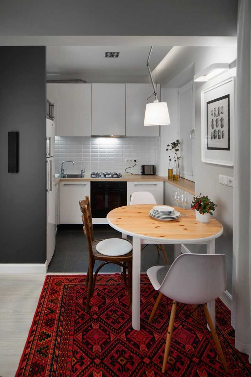 Однако можно использовать для сокращения количества движений обеденный стол с закругленными уголками. Его использование в качестве рабочего элемента позволяет создать характерный треугольник. А если рядом расположить холодильник, то все минусы линейной планировки нивелируются сами собой.