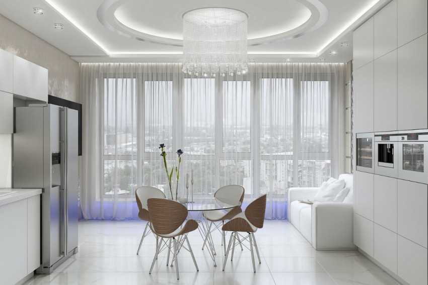 Обязательное условия этого стиля — наличие современной бытовой техники. Рабочая зона должна быть оснащена многофункциональными бытовыми приборами, металлические фасады которых не стоит прятать за дверками шкафов, а лучше, наоборот, выставить их напоказ. Украшать стену гостиной должен большой плоский телевизор. Мебель должна радовать взгляд стеклянными элементами, блеском хрома и глянца. Фото дизайна кухни- гостиной 19 кв. м можно увидеть ниже.