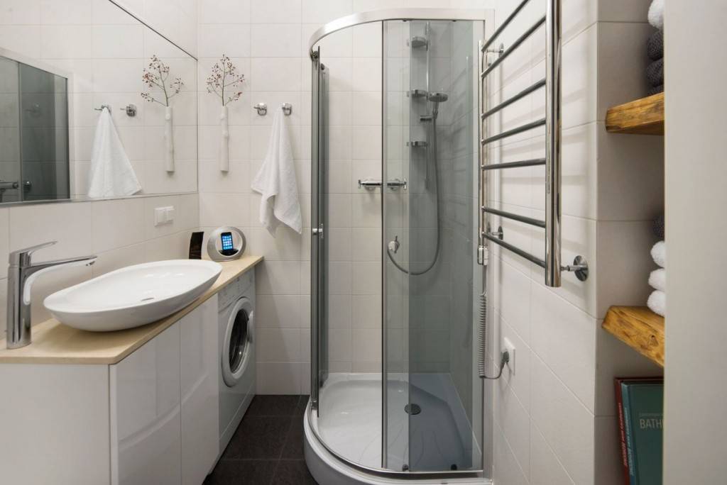 Замена громоздкой ванны на компактную душевую кабину позволит выделить место для стиральной машинки