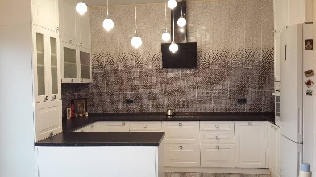 Зону над мойкой, плитой и столешницей желательно защитить керамическим покрытием (плиткой, гладким искусственным камнем) или закаленным тонированным стеклом.