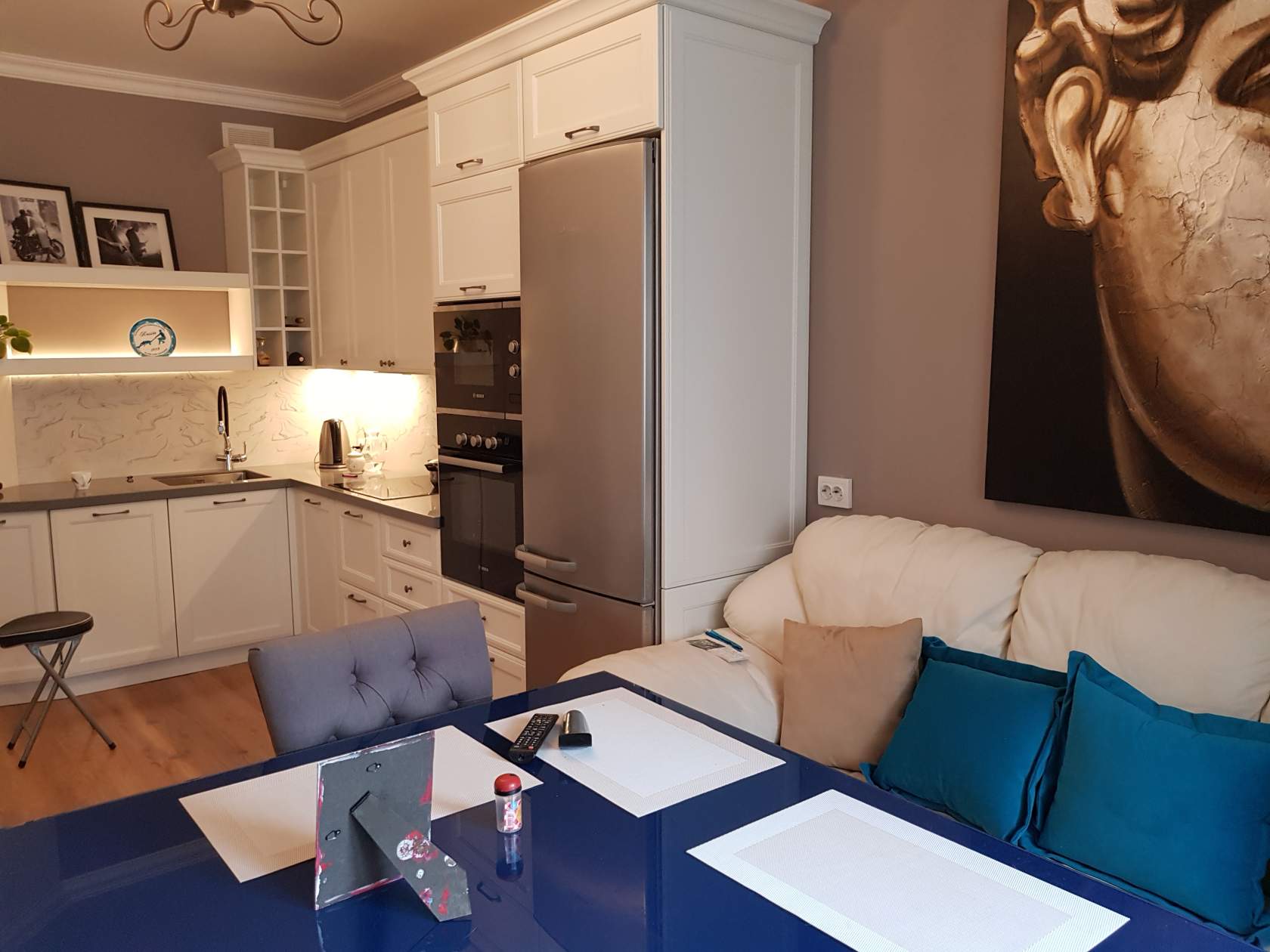 - Шикарная и большая люстра над столом (стеклянная, кованая или хрустальная).