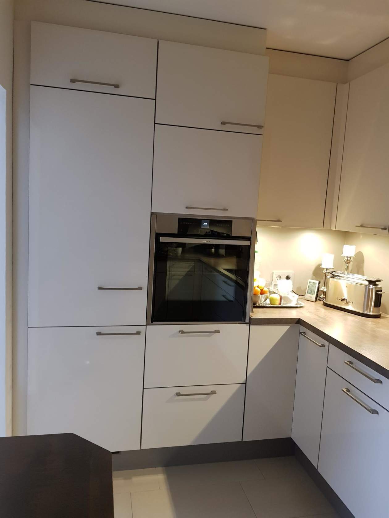 Масштабная кухня столовая со встраиваемой бытовой техникой в мебельный гарнитурИсточник pinterest.ru