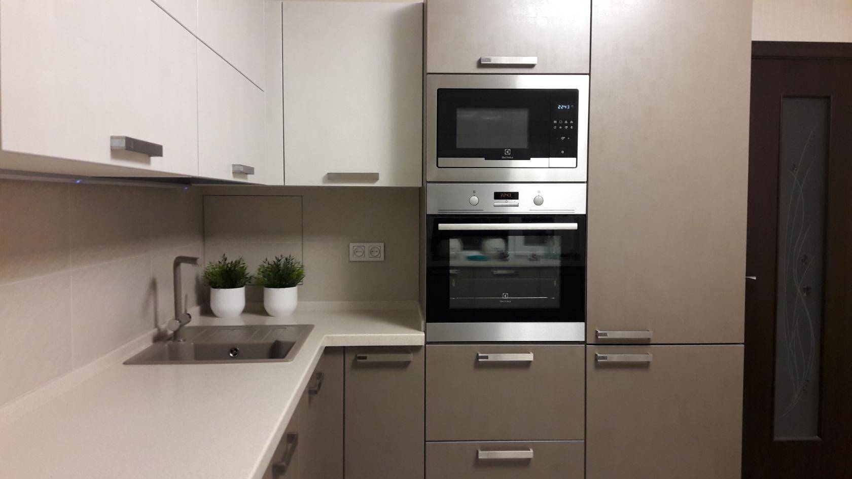 Применяйте практичность по максимуму. Это заключается в следующих мини-рекомендациях: устанавливайте встраиваемый духовой шкаф на уровне рук и глаз; выделите место для выдвижных ящичков в нижней части гарнитура; покупайте вытяжку с наклонным механизмом, это снизит риск получения травмы во время готовки; проектируйте столешницу так, чтобы она не разрывалась мойкой или плитой. На цельной поверхности гораздо удобнее готовить.