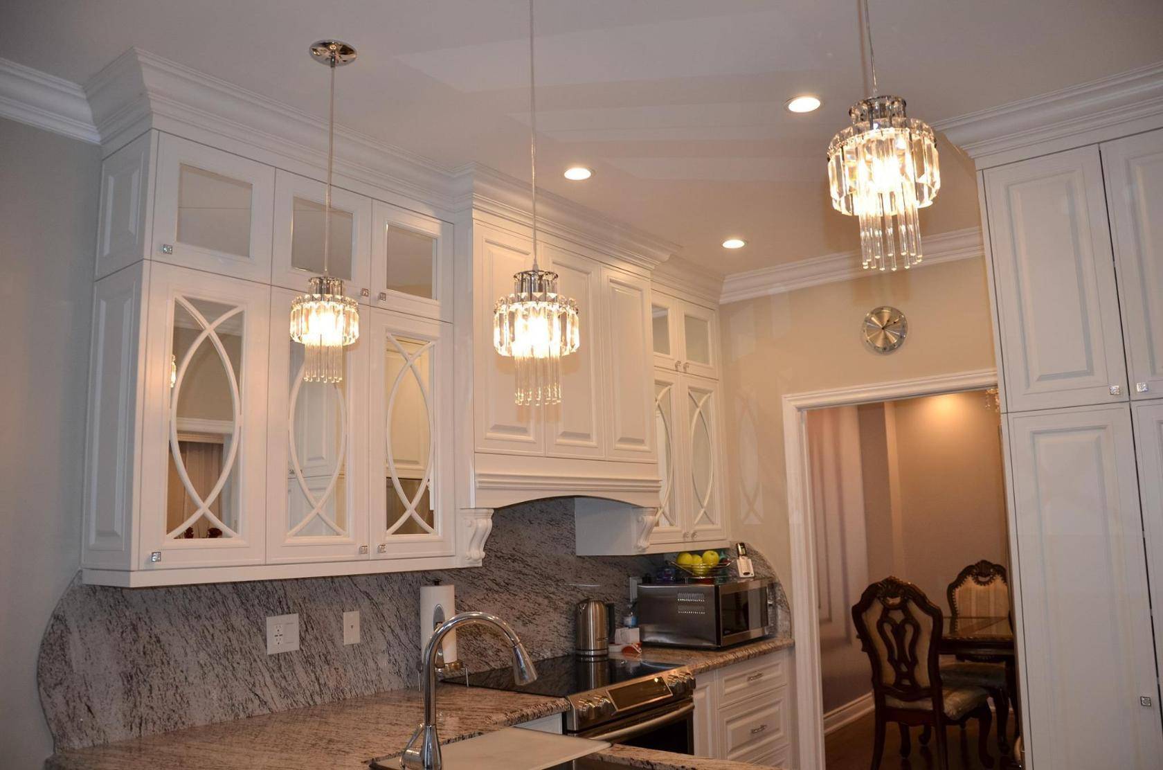 - Шикарная и большая люстра над столом (стеклянная, кованая или хрустальная).