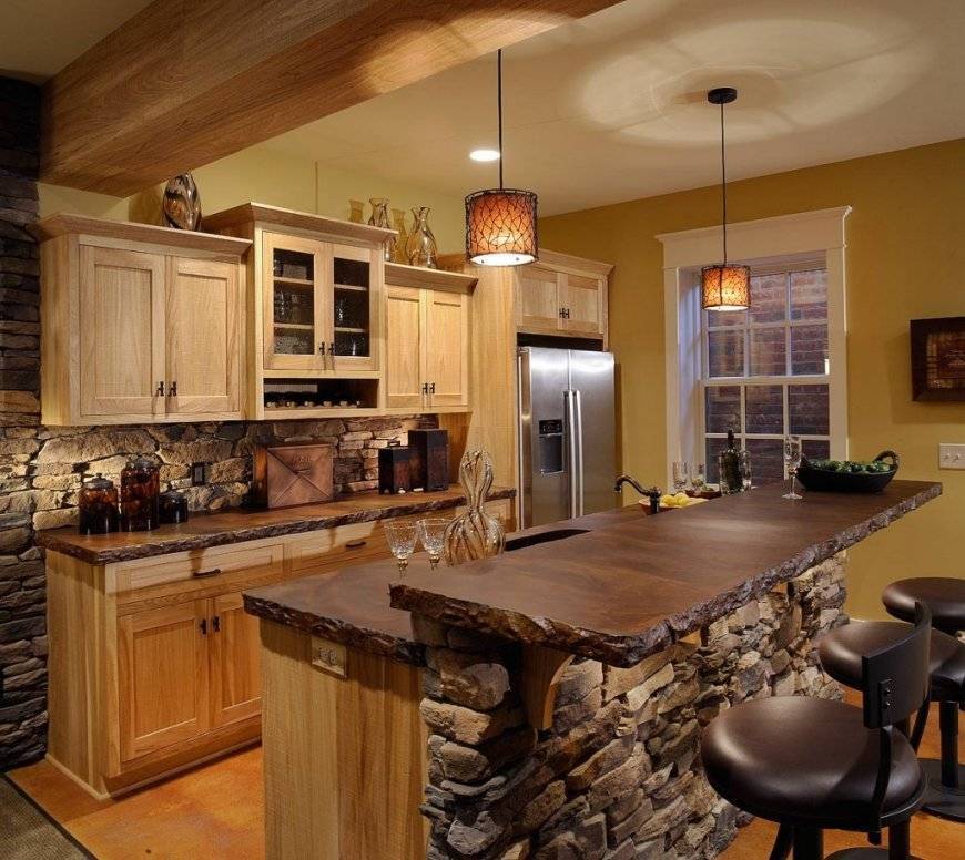 Можно ли использовать краски насыщенней, ярче? — Да, отвечают специалисты. Кожаная обивка барных табуретов, например, может быть винного, темно-вишневого, желтого цвета, а штора и салфетки – бордовыми. Главное – воздержаться от кислотных, неестественных для окружающей природы красок.