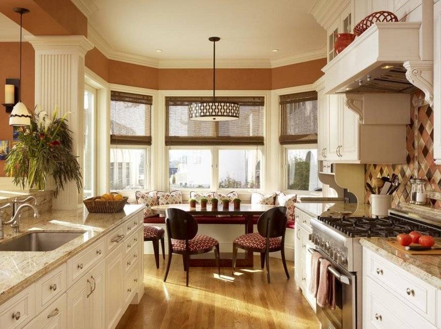 Ещё классические кухни в интерьере предусматривают наличие ниш в стенах, а сами стены можно обить деревянными панелями, покрасить или оклеить тяжёлыми обоями. Объединять пол с потолком и стенами могут дорические или ионические колонны, если для этого помещение располагает необходимым пространством.