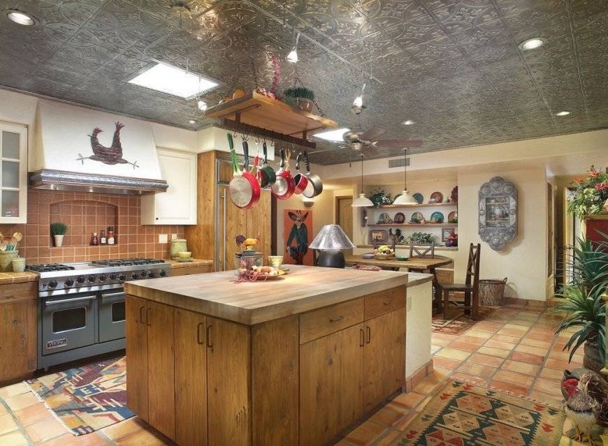 Просто побелить потолки или выкрасить их водоэмульсионкой будет недостаточно, потому что неизменной приметой деревенского дома являются потолочные балки. В вашем варианте они могут быть сделаны не только из дерева, но и из более легкого полиуретана. Однако такой дизайн будет возможен лишь в помещении с высокими потолками. Если в вашей кухне установить такие балки нереально, выручат натяжные или простые подвесные потолки. Выдержать общую стилистическую гамму поможет игра цветами и правильное освещение. Сделайте его не белоснежным до синевы, а молочным или даже бежевым. Встройте в такой потолок светильники и оденьте их в плетеные абажуры «под старину». Присутствие современных плафонов на кухнях в деревенском стиле можно попытаться уравновесить стилизованными под уличные фонари коваными люстрами.