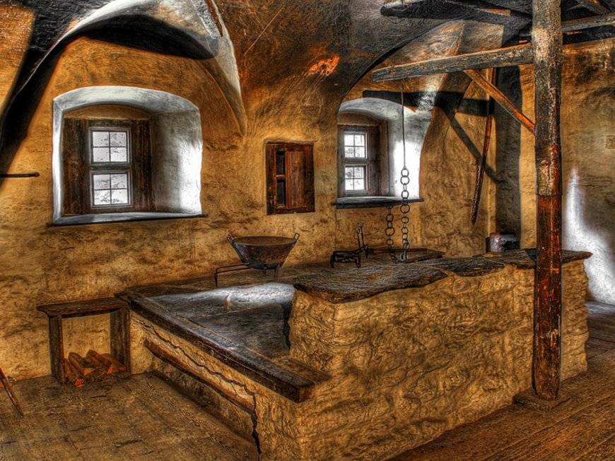 К примеру, для кухонного интерьера, выдержанного в классическом русском стиле, характерно грубое напольное покрытие и невзрачная отделка стен, побеленный потолок.