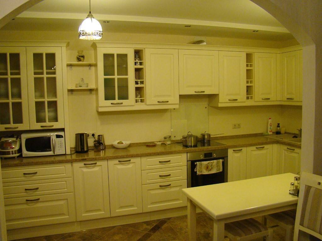 Классическая кухня в молочном цвете с декоративными накладками неплохо смотрится с подсветкой в полках и открытых посудных шкафчиках. Минус таких гарнитуров в том, что на внутренних поверхностях быстро скапливается пыль. Кафельный пол под мрамор подчеркивает общую обстановку. Обеденная зона — круглый стол с белоснежной скатертью и стульями.