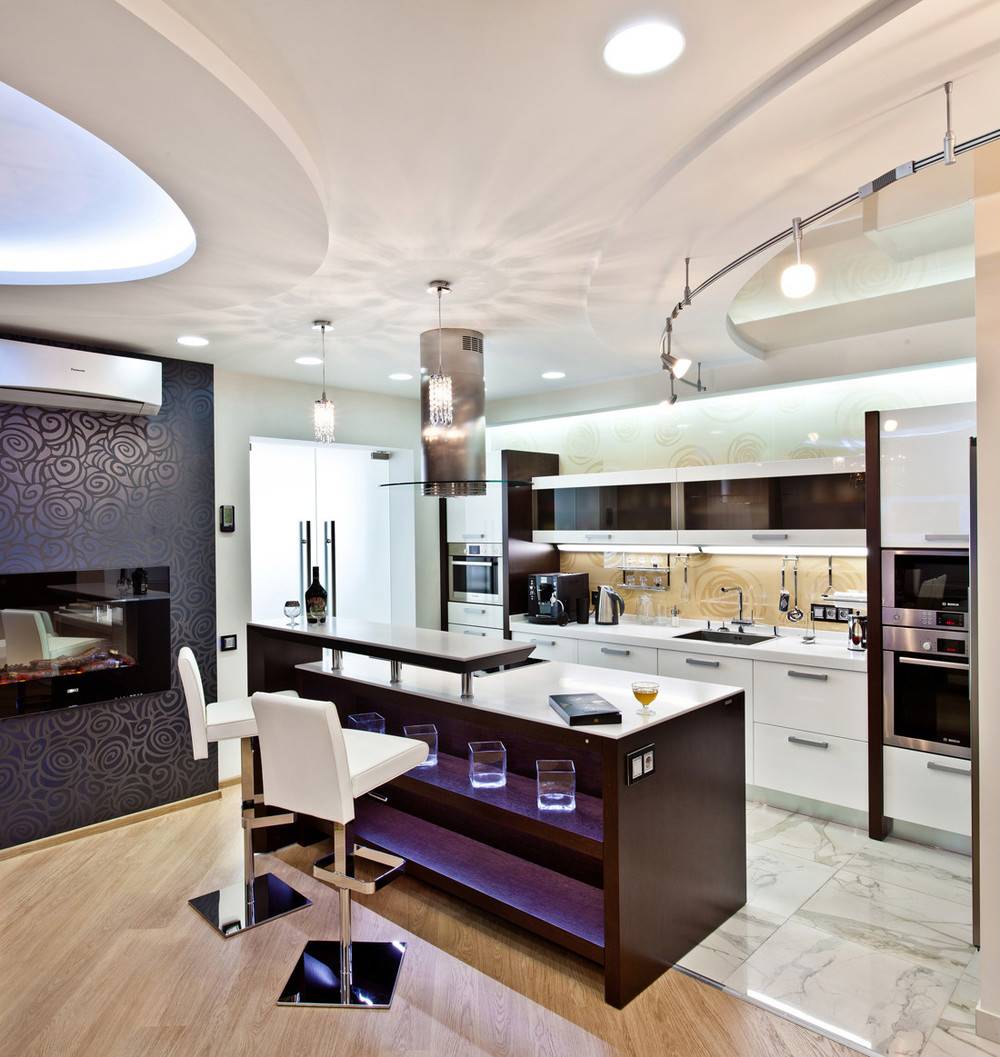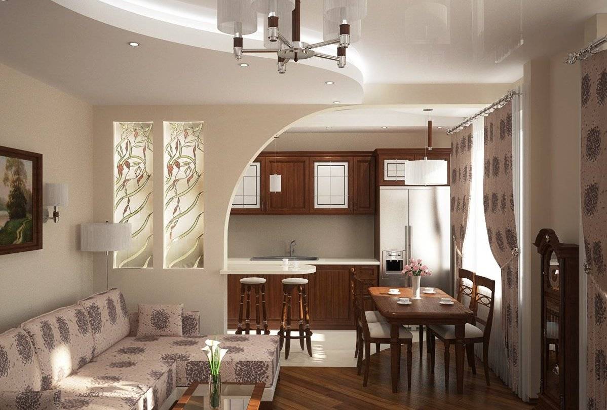 Зонировать помещение можно с помощью двухуровневого потолка, либо специально подобранного освещения. Обеденный стол не должен быть слишком массивным, отличным решением станет установка круглого стола в углу кухни.