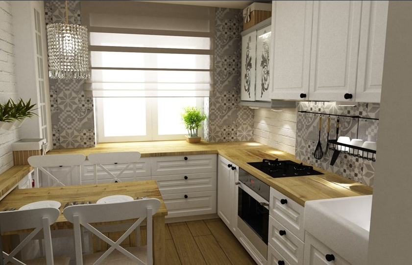 Что касается гарнитура, то выбирать стоит исключительно Г-образную или прямолинейную модель, которая не будет занимать слишком много места и не затруднит передвижение по кухне. От использования кухонного острова придется отказаться.
