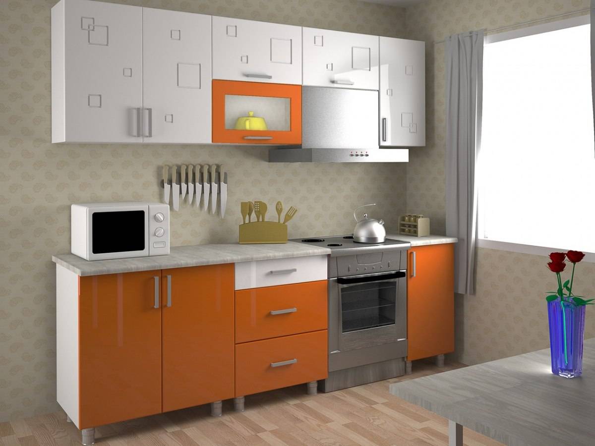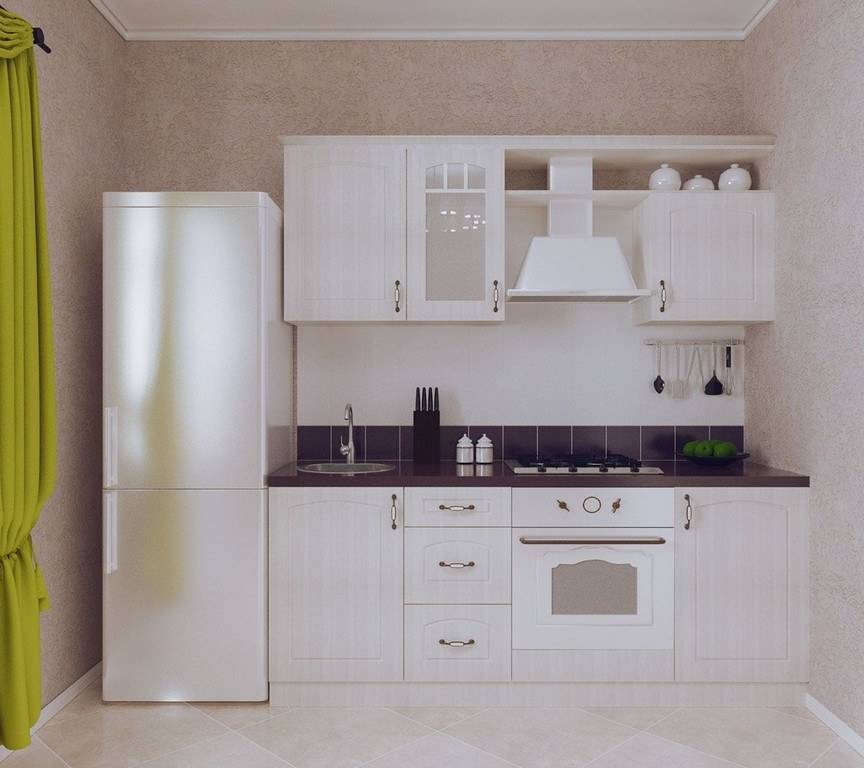 1. Однорядная. Подходит для помещений маленьких размеров. Рабочие поверхности размещают по одной стороне.