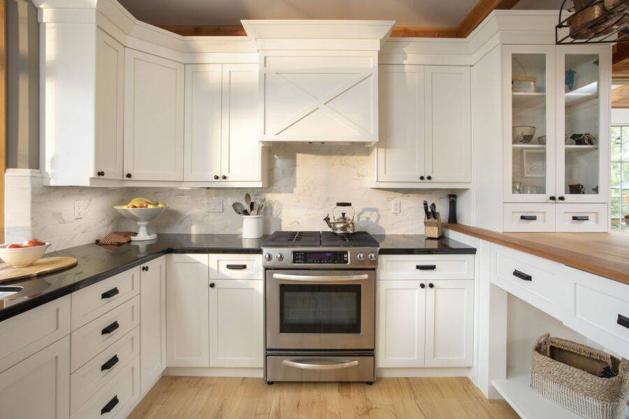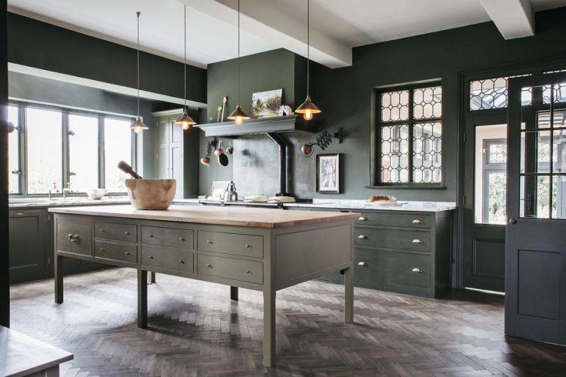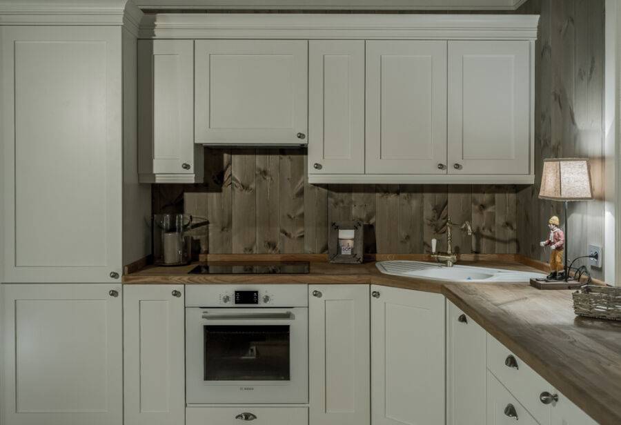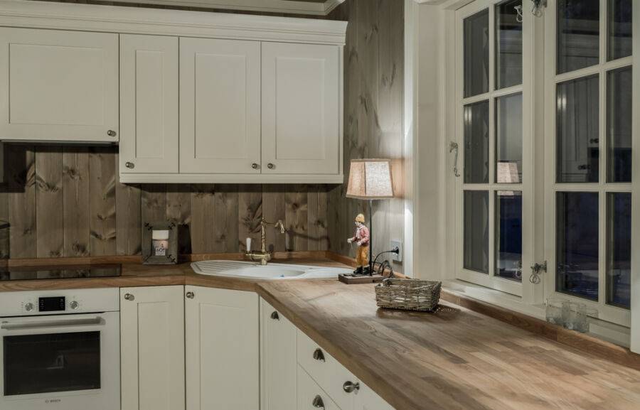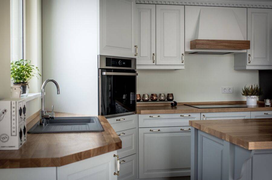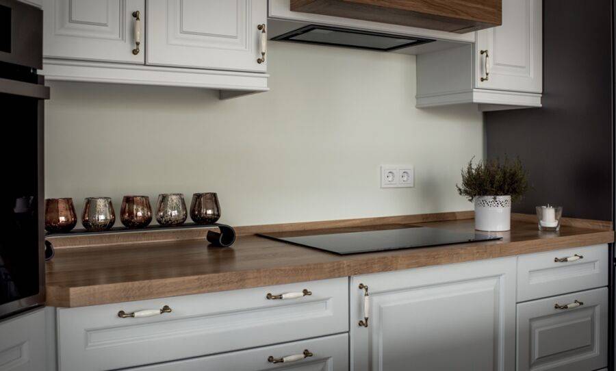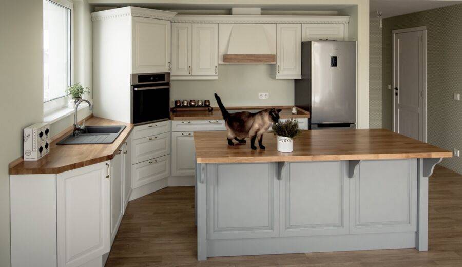 Для классики характерна натуральная мебель из массива. Древесина твердых пород (дуба, бука, граба и ясеня) более практична, если вы любите готовить и будете использовать мебель по полной.