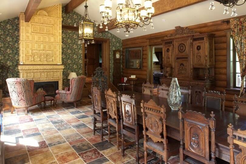 Используются только натуральные материалы. Мебель – классическая, деревянная. В центре – массивный дубовый стол. Буфеты обязательно содержат стеклянные дверцы. Основной цветовой фон – темный. В текстильных элементах присутствуют цветы и клетчатые орнаменты.