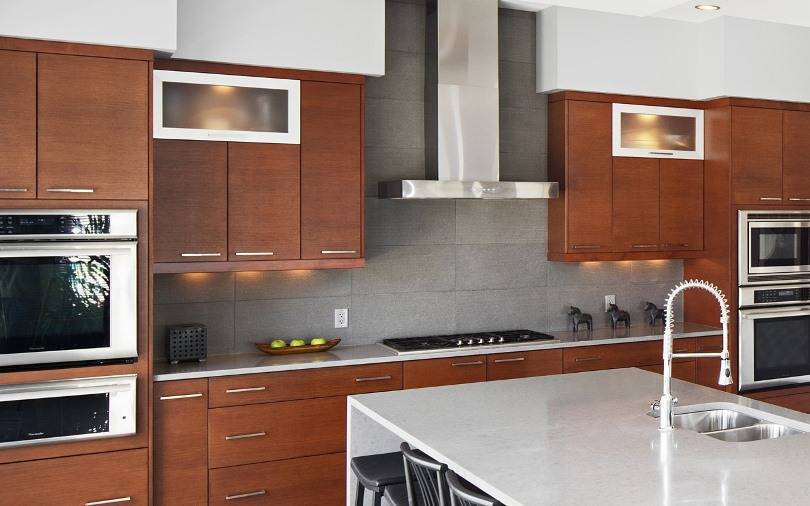Кухонный фартук – это не прихоть, а реальная необходимость в зоне у рабочей поверхности от плиты до мойки. Тут идеальна плитка, искусственный камень, специальные полимерные панели или даже стеклянная пластина. То есть все то, что хорошо моется. И в чем будет минимум марких швов и стыков.