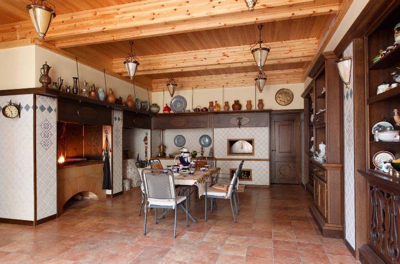 Потолок выполняется из деревянных балок и не облицовывается. В оформлении стен выделяются участки из натурального камня. Надо задействовать максимум украшений. Хорошо смотрятся ковры и шкуры.