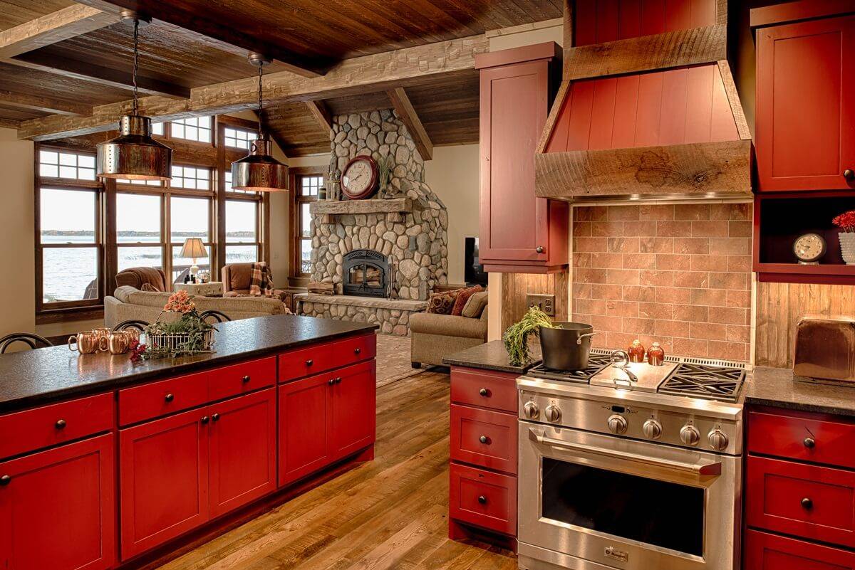 Красная кухня — смелое и необычное решение, но в стиле кантри она выглядит достаточно спокойно. Матовые брусничные, терракотовые и бордовые тона великолепно смотрятся на фасадах гарнитура, элегантно повторяются в мелком рисунке текстиля, посуде и декоре.