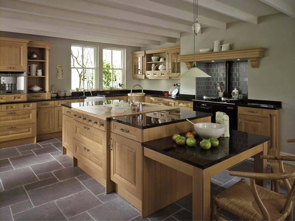 Полы. В качестве напольного покрытия также рекомендуется использовать дерево, причем лучше всего подойдет массив (ни в коем случае не паркет). Пожаробезопасной альтернативой древесному массиву станут керамическая плитка или керамогранит. Искусственные материалы – например, ламинат или линолеум – тоже допустимы, но нежелательны. Да, такие покрытия могут имитировать довольно широкий спектр натуральных материалов, в том числе недоступных при среднем достатке,но с ними вашу кухню точно нельзя будет считать эталоном стиля.