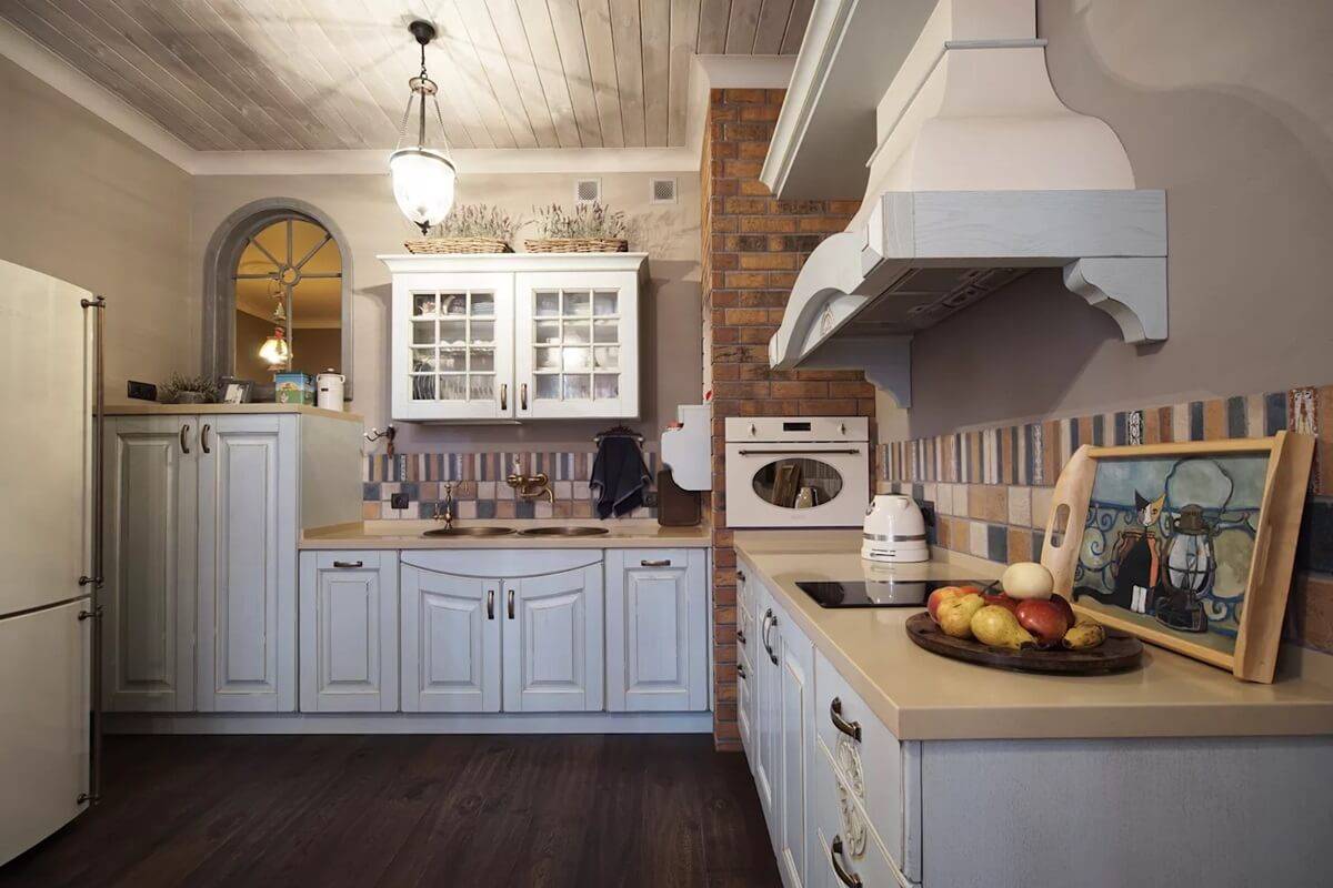 Дополнить прованский стиль можно белоснежным потолком и полом из темного дерева. Фасады кухонной мебели должны быть зелеными, а сама рабочая поверхность – белоснежной. Фартук оформите в терракотовой гамме.