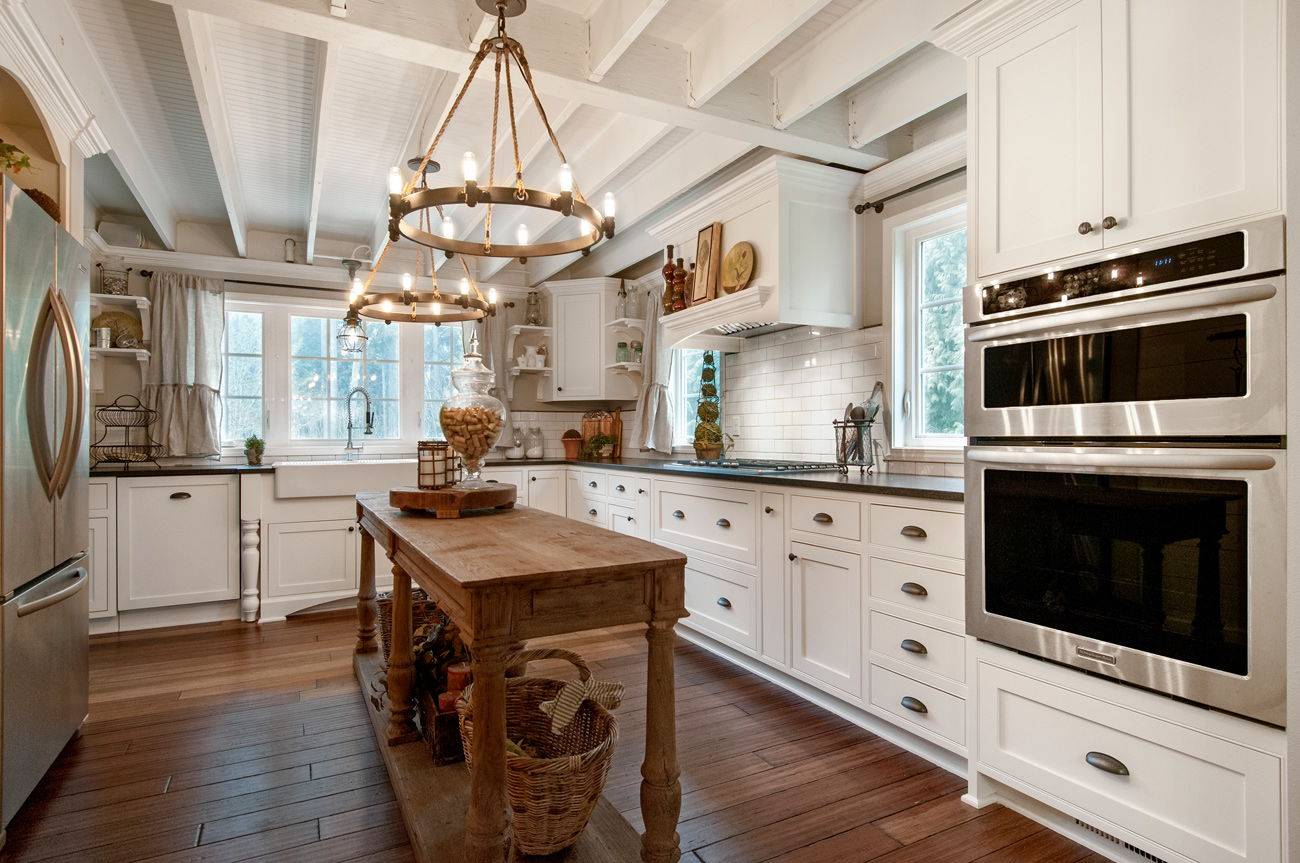 В классическом понимании оформления кухни кантри на потолке должны быть деревянные балки. Но в квартирных условиях и в маленьких столовых загородных домов такой вариант применить невозможно, даже в качестве обычной декорации. На замену приходит простая побелка, без всяких дизайнерских элементов. Белый потолок наполнит кухню светом, деревенским уютом. Если необходим более современный подход к оформлению, используют подвесные конструкции с рисунком под дерево.